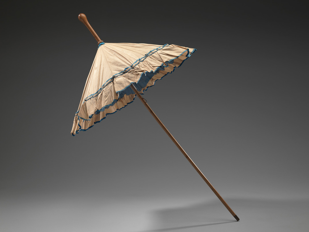 Parasol met houten steel, met aan het uiteinde een metalen knop omdat de parasol tevens diende als wandelstok. Het dek is van cremekleurige zijde, afgezet met geplooide ruche van dezelfde stof, afgezet met blauwe zijde aan weerskanten, op de aanzet een blauw koord. Boven het dek restant van blauw zijden strik. Voering van blauwe zijde, geknipt in schulpen. Op het dek een lange houten punt met knop. Spaken van metaal en uitlopend in metalen knoppen.