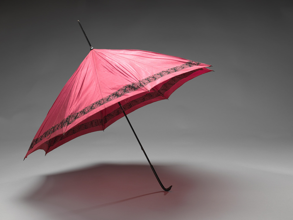 Paraplu, met metalen steel, met houten handvat, gebogen uitlopend in een hondenkop. Het dek is van rode zijde met ingeweven rand met zwarte motieven. Voering van cremekleurige zijde. Door het dek een lange metalen punt, uitlopend in een knop, met een houten ring het die het frame op zijn plaats houdt. Spaken van metaal en uitlopend in metalen knoppen.
