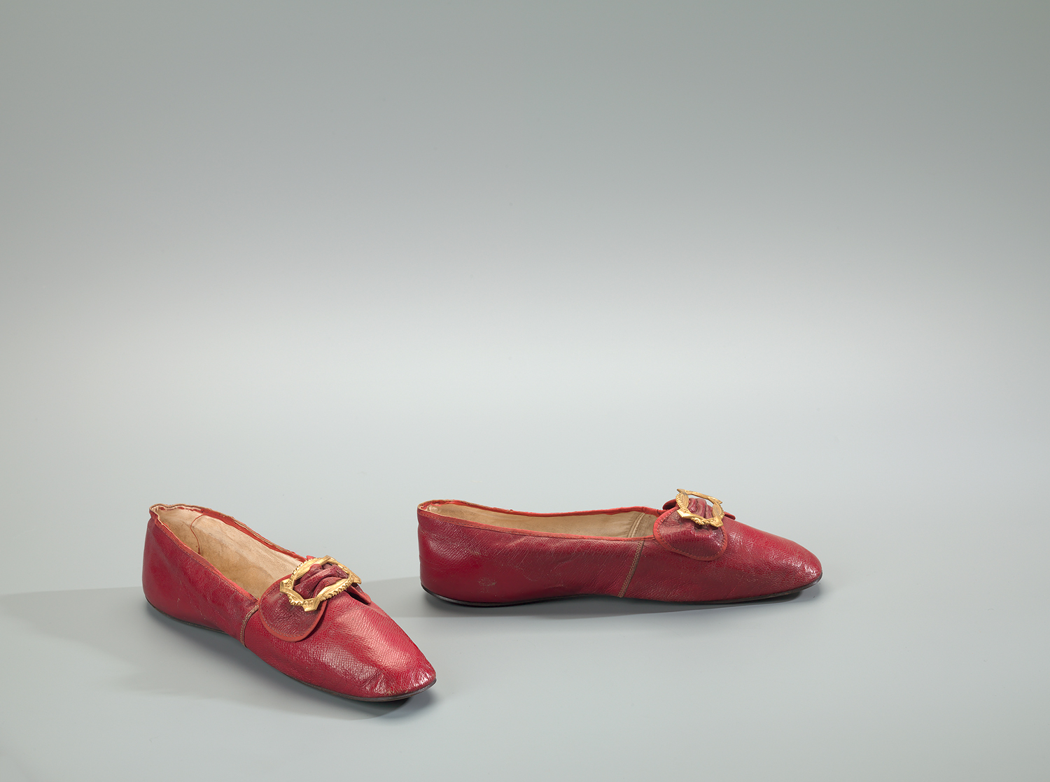 Huisschoenen van rood leer. Taps toelopend, smal, hakloos model. Op de wreef een strik van rood leer met daarop een ovalen koperen siergesp. Zool van bruin leer. Binnenzool en voering van linnen en leer.