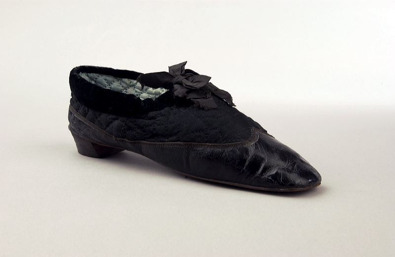 Zwart schoen of pantoffel van doorgestikte zijde, lakleer, fluweel met blauwe gestikte voering, lintsluiting met hakje, geen links en rechts. Leren zool, gedragen. Zie ook KA 1348.1/2 en KA 1336.1/2.