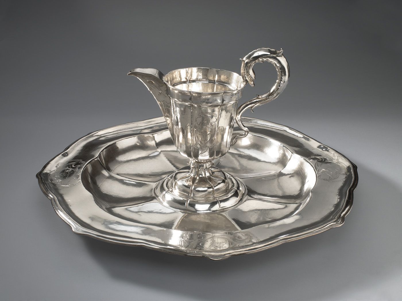Bekken met brede geprofileerde rand, rooskantig gelobd. Achtlobbig plat met verhoogde umbo en geponste rand, waarover voet van de kan sluit. Op umbo is het gekroonde stadswapen van Amsterdam gegraveerd, gehouden door twee leeuwen. Op rand vier gegraveerde asymmetrische cartouches van kwabornamenten, elk met een wapen. Boven en onder wapens spreukbanden met namen en jaartallen: IOAN HUYDEKOOPER RIDDER/ HEER VAN MARSEVEEN/ Ao. 1655/; IAN VAN DE POL./ ANNO 1655./; CORNELIS DE GRAEF, VRY-HEER/ VAN ZUYTPOLS-BROECK. Ao. 1655/ en: HENDRICK DIRCKSZ SPIEGEL./ ANNO 1655./.