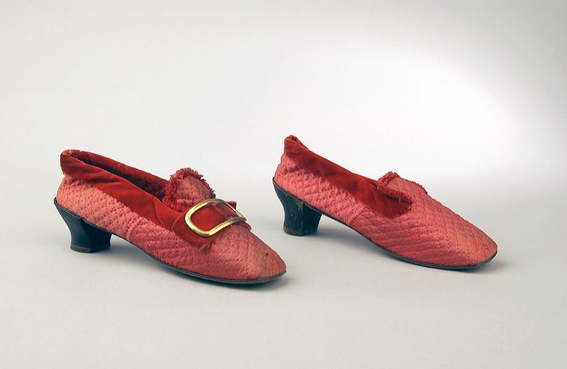 Paar huisschoenen van rode doorgestikte zijde gewatteerd met dezelfde voering, fluwelen rand, met lage hak, handwerk. Op de neus een lip met koperen gesp, die bij één schoen ontbreekt. Leren zool. er is geen onderscheid tussen linksn rechts. De vierkante neuzen zijn typerend voor de periode 1870-1880.
