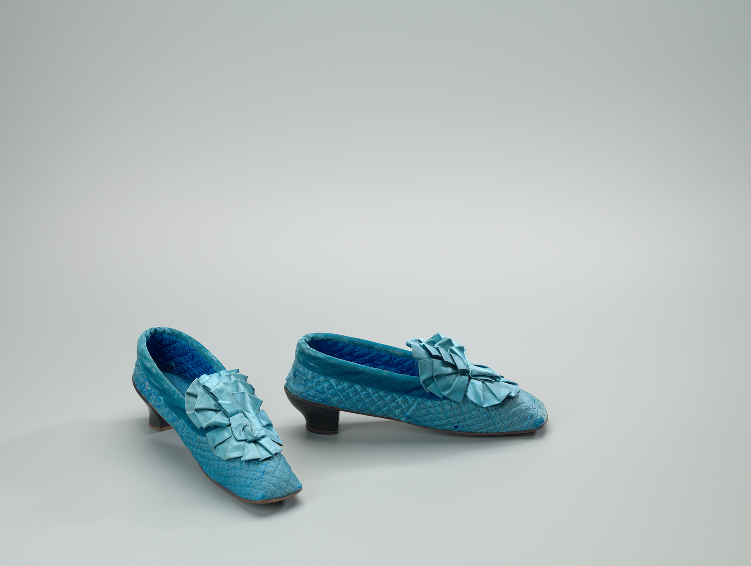 Huisschoenen van blauwe met de hand doorgestikte gewatteerde zijde. Model met een vierkante neus en een laag hakje. Langs de opening van de schoen loopt een blauwe fluwelen rand. Op de neus een blauw satijnen rozet. Zool van bruin leer, en hak van zwart leer. Voering van blauwe zijde.