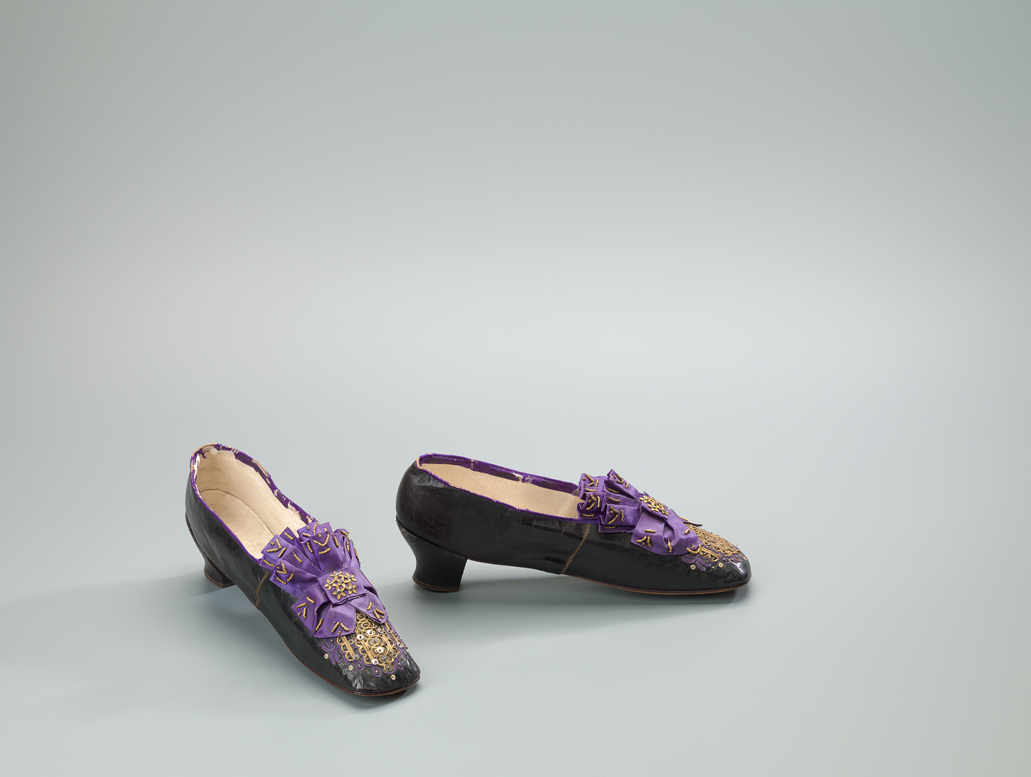 Zwarte goudleren open schoenen met op de neus kralenborduursel van goud bloemen en paars zijde rozet van satijn lint. Model met lage hak. Langs de opening afgezet met een paarse zijden bies. Het kralenborduursel van gouddraad, paarse draad, pailletten en kralen op de neus is van te voren gemaakt en werd in zijn geheel op de neus vastgezet.
