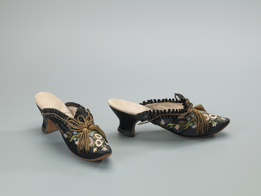 Muiltjes van zwarte zijde satijn. Hielloos model met puntig oplopende neus en hak. Langs de opening afgezet met ruche van zwarte zijde satijn en goudgalon. Op de neus versierd met goudgalon en twee kwastjes, en handgeborduurd in neo rococo stijl met floraal motief in paars, roze, lichtblauw, groen en wit zijdedraad. Zool van bruin leer, en met zwart satijn beklede hak. Binnenzool en voering van wit satijn.
