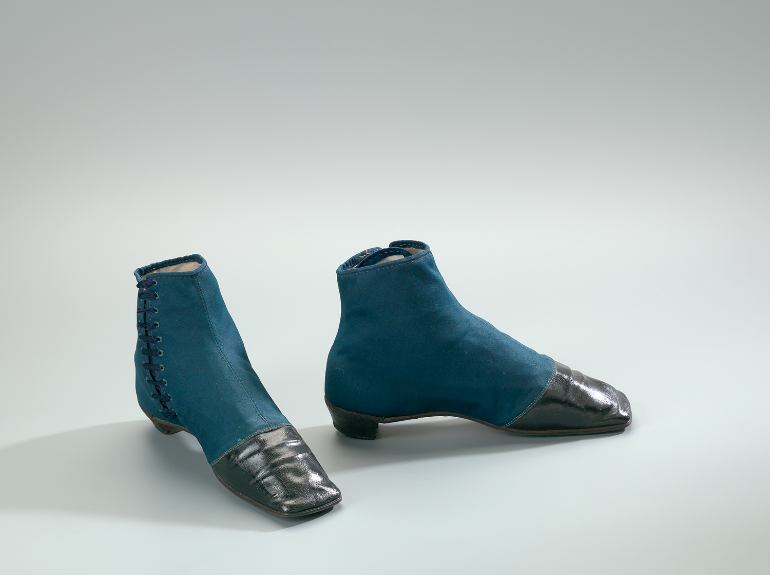 Rijglaarzen van blauwe serge. Enkelhoog model met vierkante leren neus en laag hakje. Vanaf de bovenkant tot aan het leren gedeelte op de neus loopt een lange naad. De schoen sluit door middel van een rijgsluiting die die aan de zijkant van de enkel loopt, met twintig oogjes en een blauwezijden veter. Langs de bovenzijde en de opening loopt een blauwe zijden bies. De tong achter de vetersluiting is van blauwe serge en afgezet met idem bies. Zool van zwart leer, hakje van meerdere op elkaar gestapelde laagjes zwart leer. De schoenen zijn met ecrukleurig linnen gevoerd.