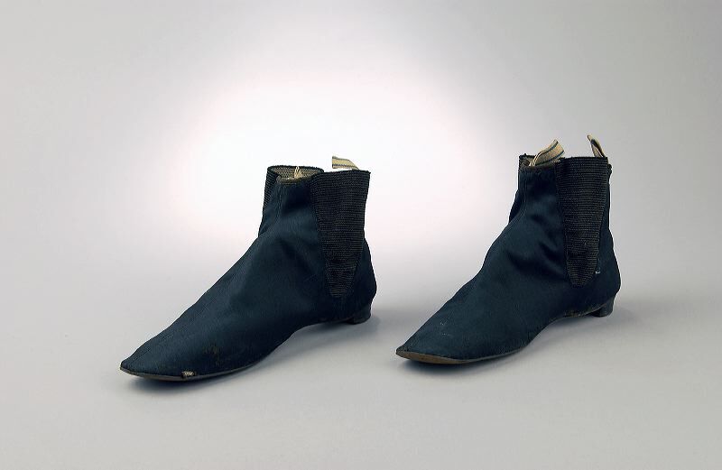 Paar enkellaarzen van zwarte serge of lustre met elastieken tussenstekken treklussen, geen links en rechts, met hak. Voering van cremekleurig linnen, zeemleren binnenzool. Zeemleren voering komt later. Stof hetzelfde als streekdracht stoffen.