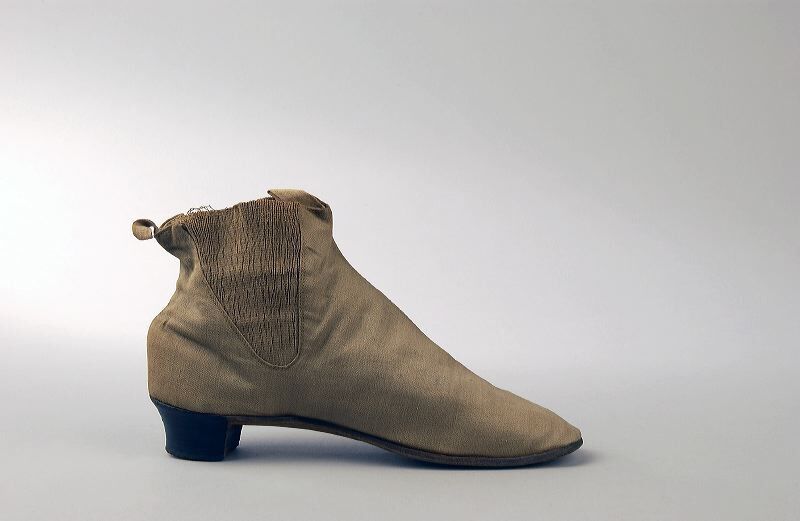 Enkele enkellaars beige latoen met elastieken tussen stukken, treklus, gespijkerde leren zool. Voering van licht keperkatoen. Geen links en rechts, modieuze laarzen.