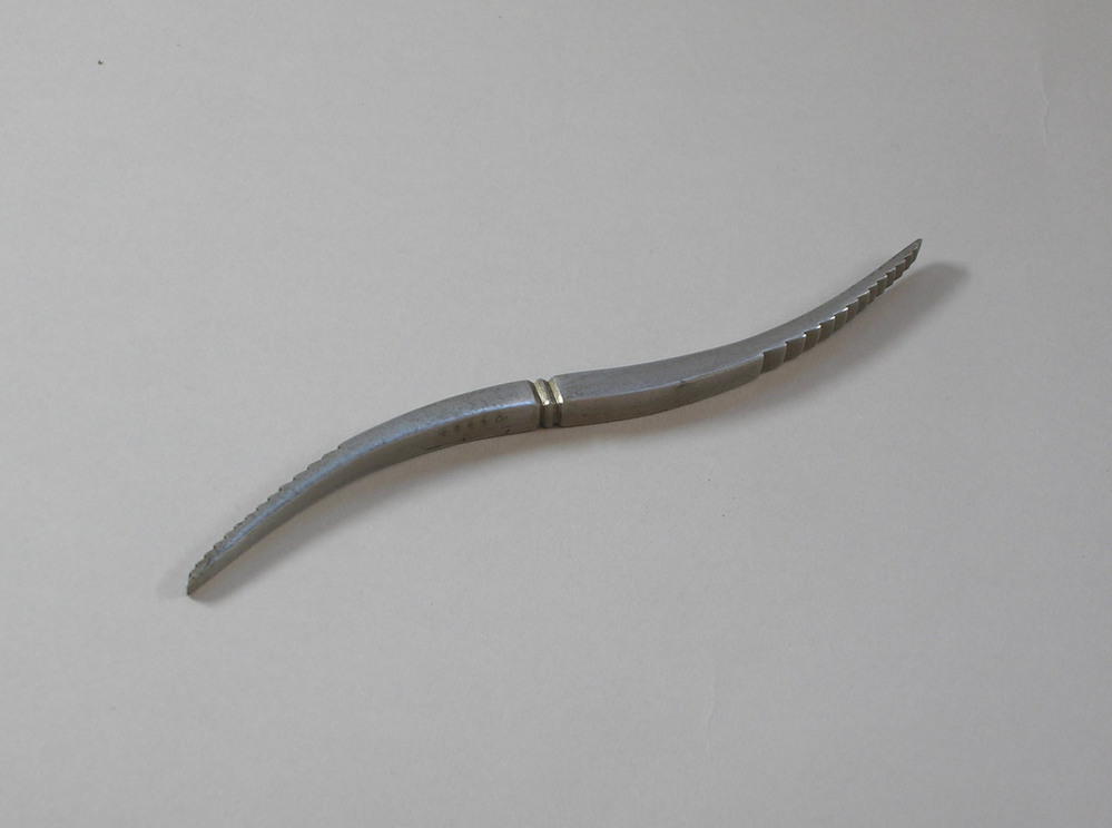 Gebruikt om bij een hoofdwond ingedrukte delen van de schedel op te lichten, zodat de bloeding eronder niet op de hersens drukte. (Bron: Tim Huisman, conservator Museum Boerhaave, 2011)