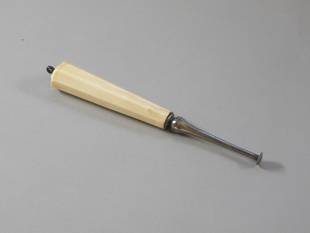 Klein raspje (het platte schijfje aan het uiteinde), om scherpe botrandjes en het beenvlies weg te schrapen bij een trepanatie (schedelboring) of een amputatie. (Bron: Tim Huisman, conservator Museum Boerhaave, 2011)- Trefwoorden