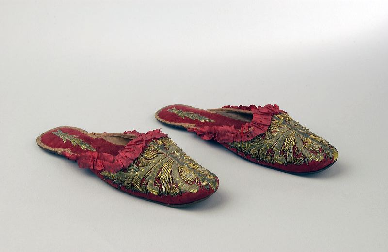 Rood fluweel met goudborduusel, zijden ruches, zonder hak. Leren zolen met bedrukte versiering. Niet Europees, mogelijk Turkije of Griekenland, Afrika. Geen links en rechts. Lint mogelijk in Europa erop gezet.