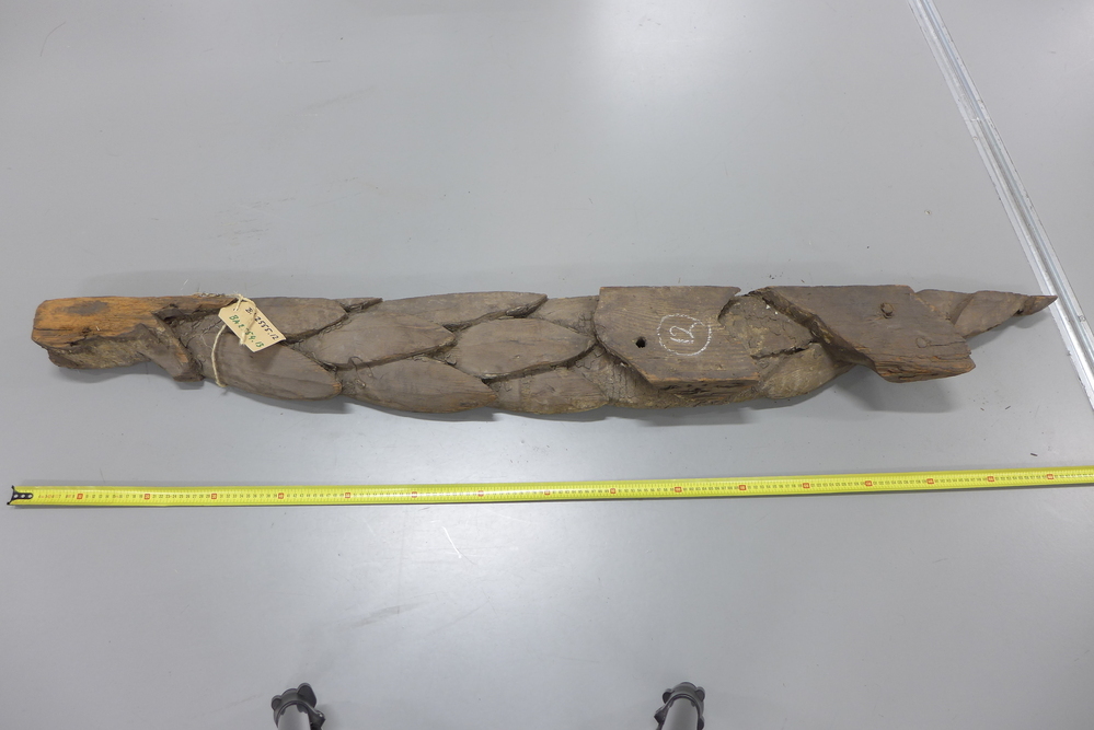 Achttien fragmenten uit de timpaan van de voorgevel, voorstellende een medaillon met de kop van Apollo, geflankeerd door zes putti die de kunsten symboliseren. Fragmenten waarvan met meer of minder grote mate van zekerheid kan worden vastgesteld dat ze deel hebben uitgemaakt van het beeldhouwwerk aan de voorgevel.