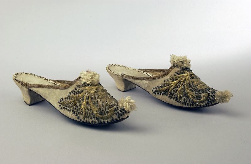 Paar muilen van wit fluweel met goud borduursel, opstaande puntneus met pompon. Een lage hak, geen links en rechts.