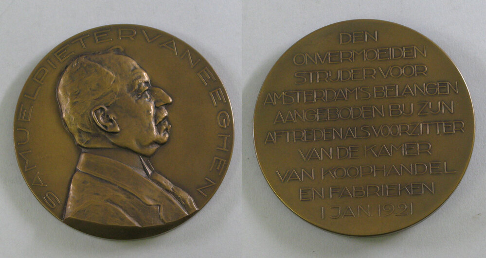opschrift keerzijde: DEN / ONVERMOEIDEN / STRIJDER VOOR / AMSTERDAM'S BELANGEN / AANGEBODEN BIJ ZIJN / AFTREDEN ALS VOORZITTER / VAN DE KAMER / VAN KOOPHANDEL / EN FABRIEKEN / 1 JAN. 1921