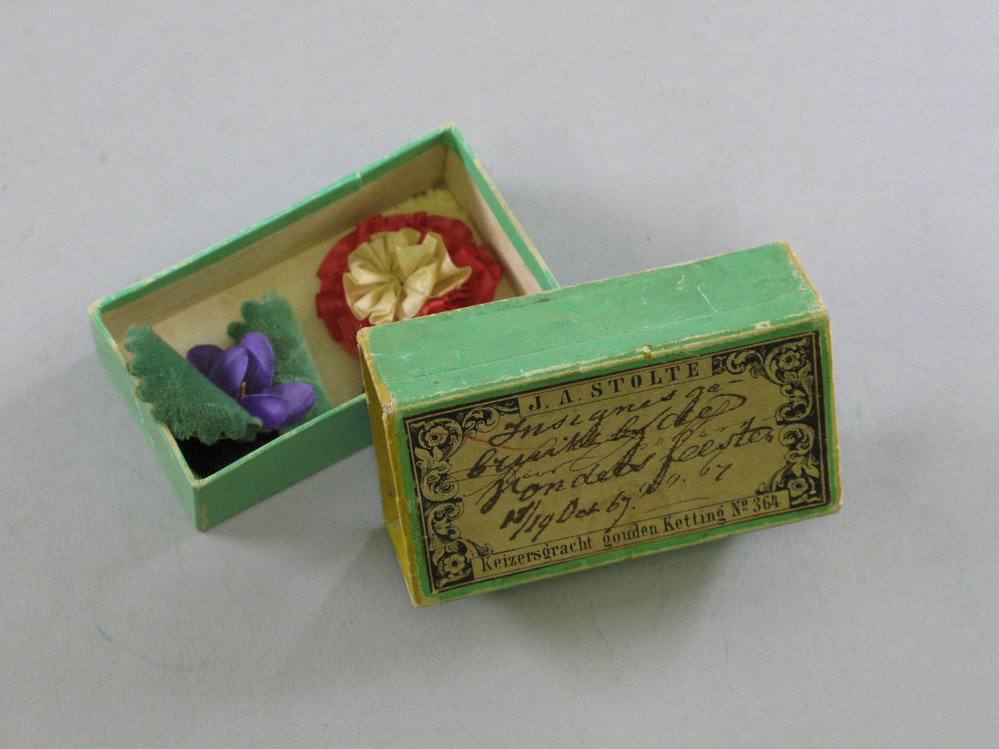 - Doosje met kleine kokarde en corsage gebruikt bij de Vondelfeesten, 13-19 oktober 1867, 1867