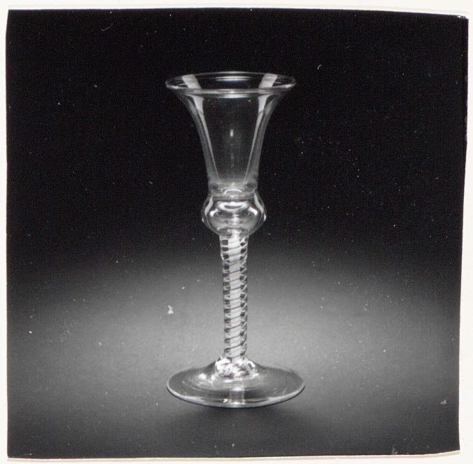 Helder kleurloos glas, opaak wit en rood glas. Conische voet. Stam met alternerend twee witte en twee rode spiralen rond witte netwerkspiraal. Klokvormige kelk met verdikte basis.- Trefwoorden