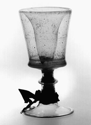 Helder kleurloos glas, voor de lamp geblazen. Licht conische voet, overgaand in holle stam met knoop. Stam gevuld met kurk. Bekervormige kelk met dubbele wand waarin vloeistof. Rondom stam resten van een donkerrood katoenen lintje.