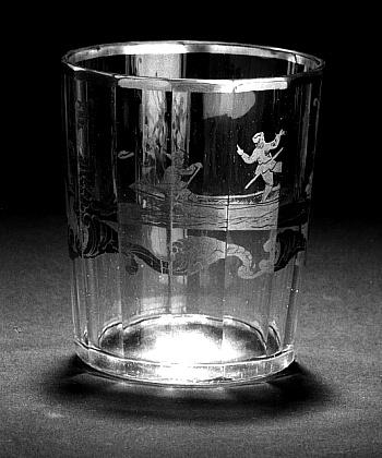 Helder kleurloos glas. Vlakke verdikte bodem. Cilindrisch, vijftienkantig gefacetteerd lichaam. Op lichaam in verguldsel rococo motieven en twee figuren in een bootje. Vergulde band op mondrand.- Trefwoorden