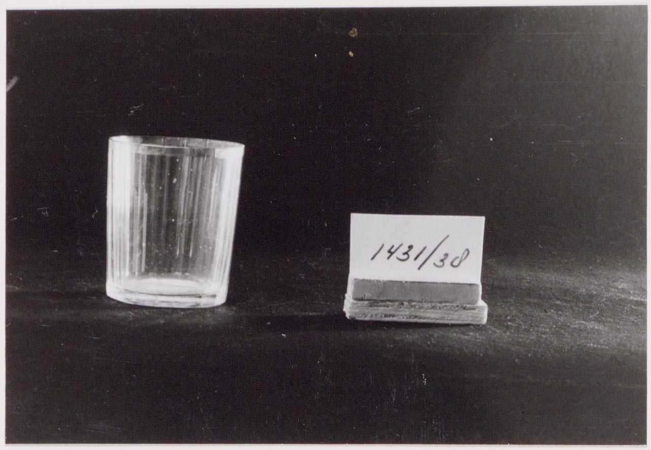 Helder kleurloos glas. Vlakke bodem. Cilindrisch, meerkantig gefacetteerd lichaam. Vergulde band onder mondrand.- Trefwoorden