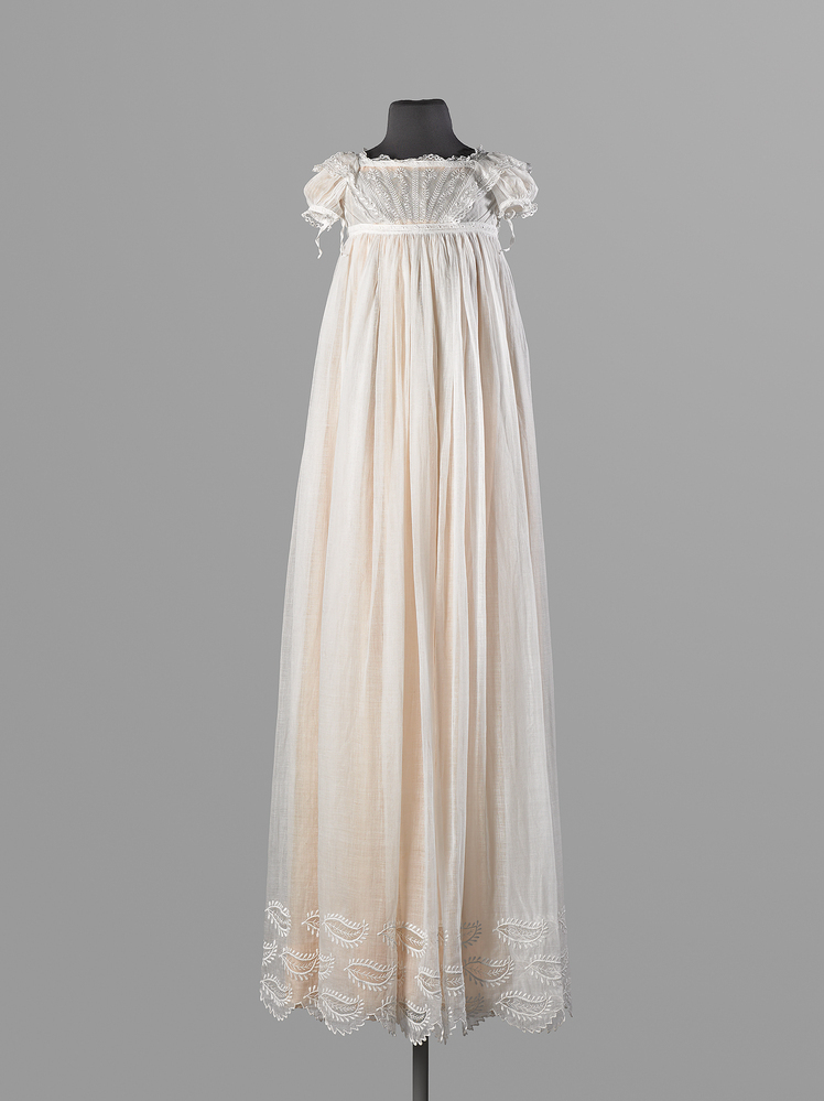 Witte, lange doopjurk van fijn batist, achter geheel geopend, aan de hals en bij het middel gesloten door bandjes gehaald door schuifjes en dicht gestrikt. Vierkant hals, afgezet met randje, geborduurd met oogjes. Korte pofmouwtjes met dito bandjes afgezet. De lange rok is tegen het lijfje ingerimpeld, hier een zelfde bandje. Achter aan de hals een geplooid kraagje, langs de rand geborduurd met takjes en oogjes. Dit kraagje is boven op de schouders met één punt gehecht aan een naar het middel toelopende volant, die geborduurd is met takjes, blaadjes en 4 bloemen en driehoekig plastron insluit met gestileerde “korenbloemen” en doorlopende takken van blaadjes en bessen. Langs de hals, mouwtjes, kraag en volants een kantje. De brede uitgetande, gefestonneerde onderrand heeft 3 rijen, geïncrusteerde, geborduurde bladfigurem met machinale tule. Links op het middel wordt een lange crème, zijden strik van ripslint gedragen (KA 13091.2). Dit lint hoort er niet bij, latere toevoeging.