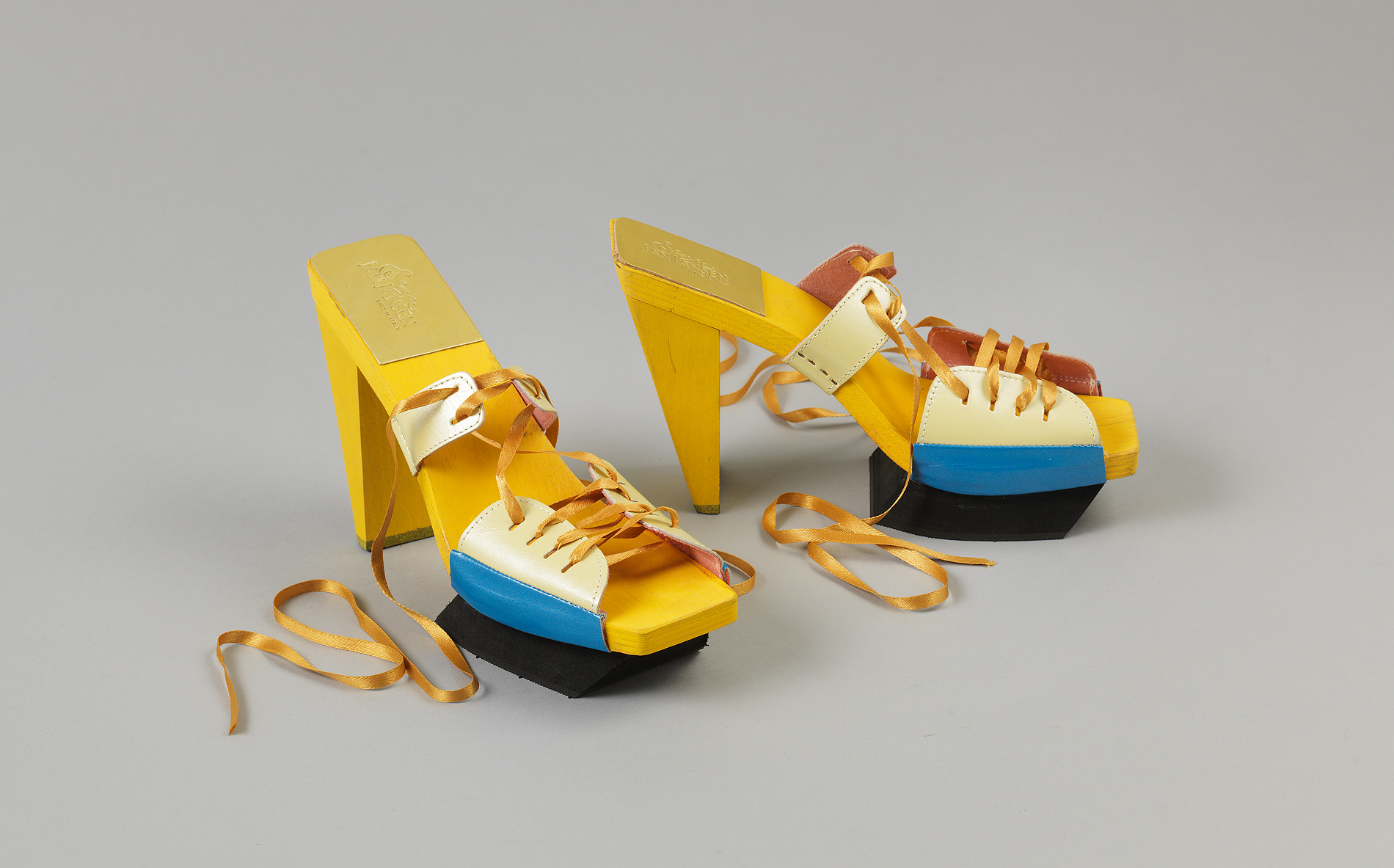 Damessandaal, frame van geel geverfd triplex en dikke rubberzool. Bovenblad is vervaardigd van twee kleuren leer, geel en blauw, en wordt gesloten door lang geel lint.