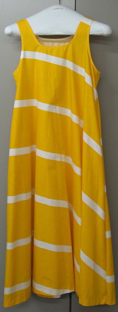 Katoen. Hardgeel. Schuin gedrukte, witte banen. Mouwloos. Ronde hals, uit één stuk geknipt. Wijd uitlopend. Bijbehorende strikceintuur en driehoekig hoofddoekje.