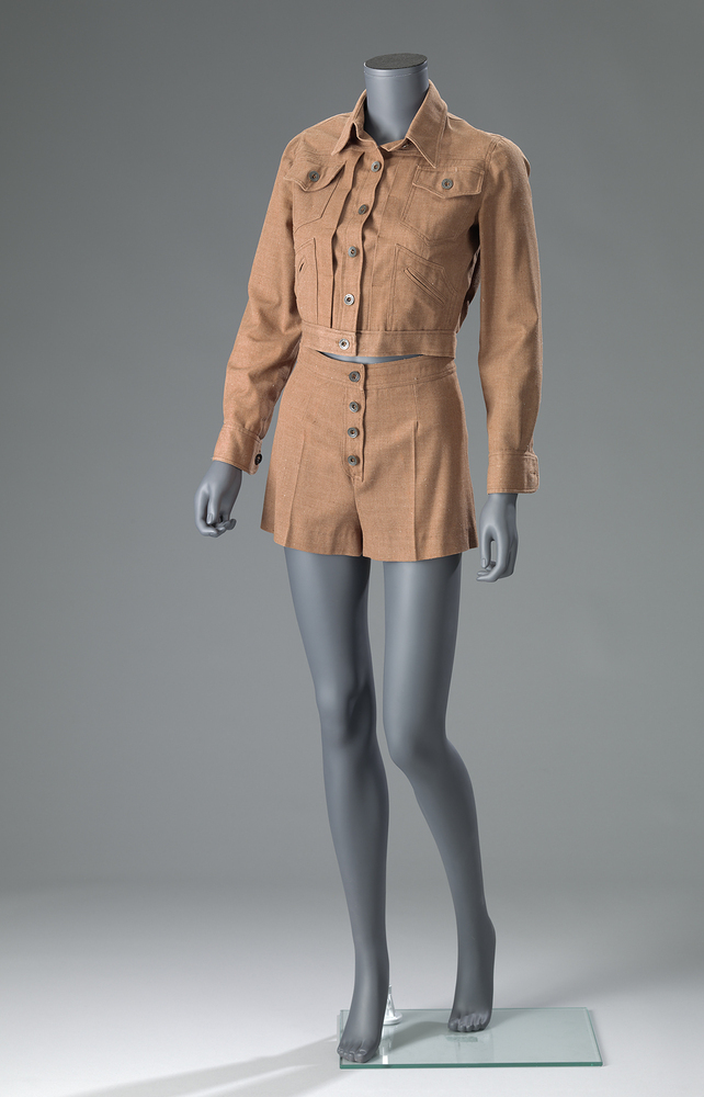 Kort jasje. Militair model z.g. battle-dress. Hoog gesloten kraag, lange mouw, twee borstzakken met klep, twee schuine steekzakken, op taillehoogte eindigend in een aangestikte ceintuur. Het jasje sluit d.m.v. zes metalen knopen met de ingestanste tekst: militaires fournitures. De kleppen van de borstzakken en de manchetten sluiten ook met deze metalen knopen. Hotpants met korte pijp, sluiting middenvoor d.m.v. vier metalen knopen en machinaal gestikte knoopsgaten. Brede opgestikte tailleband van vier cm.