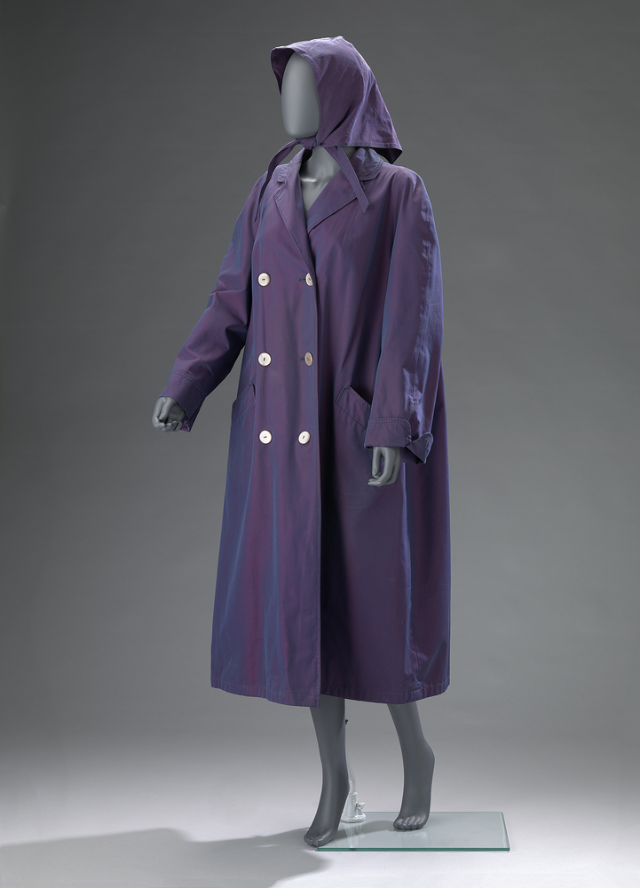 1. Paarse katoen/zijde. Het rood/blauwe garen is zodanig geweven dat er een changeant effect ontstaat. De voering is veel dichter geweven. Recht model, op voorpand schuine steekzakken op heuphoogte. De mantel sluit d.m.v. zes platte parelmoeren knopen. De mouwen eindigen in een omgeslagen manchet. 2. Regenkapje (bijbehorend).