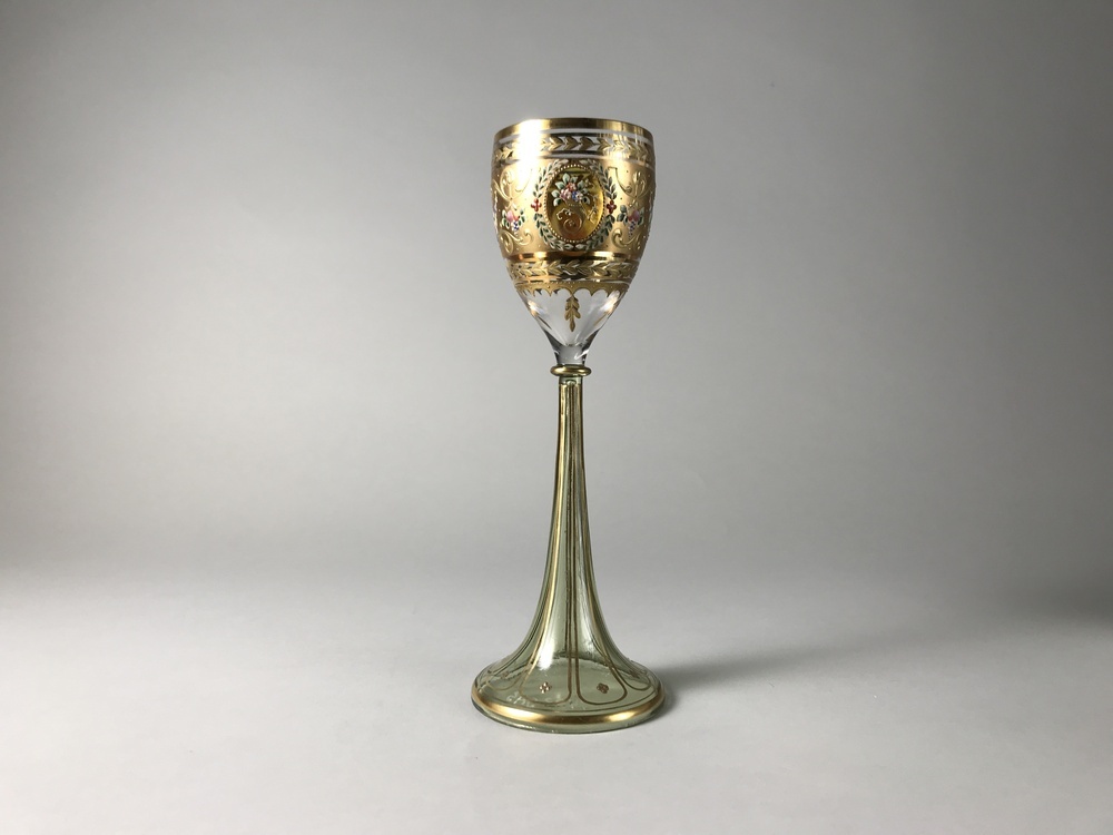 Helder kleurloos glas, helder groen glas, geel gebeitst glas. Holle trompetvormige voet, overgaand in stam met knoop van groen glas. Eivormige kelk van kleurloos glas. Kelk met twee kleuren reliëfverguldsel, bestaande uit biezen, bladranken en krulwerk. Op gouden band tegen helder geel glas uitgespaarde medaillons, in polychroom email beschilderd met bebaarde mannenkop à l'Antique met helm en een hoorn met bloemen. Tussen de medaillons festoenen met vruchten.