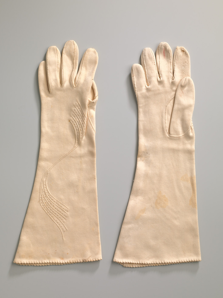 Een paar witte gebreide dameshandschoenen, bovenop de hand een golvende naad die boven en onderaan uitloopt in vijf naden. Tussen de naden zijn stipjes geborduurd in wit garen. Maat 6.