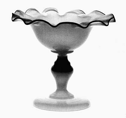 Wit opalineglas, helder blauw glas. Platte voet. Balusterstam met schijf. Wijde bolvormige kelk met uitbuigende, twaalflobbige rand. Blauwe glasdraad op rand.- Trefwoorden