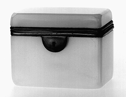 Wit opaline glas. Rechthoekig lichaam met afgeschuinde hoeken en scharnierend deksel. Messing beslag en slot.- Trefwoorden