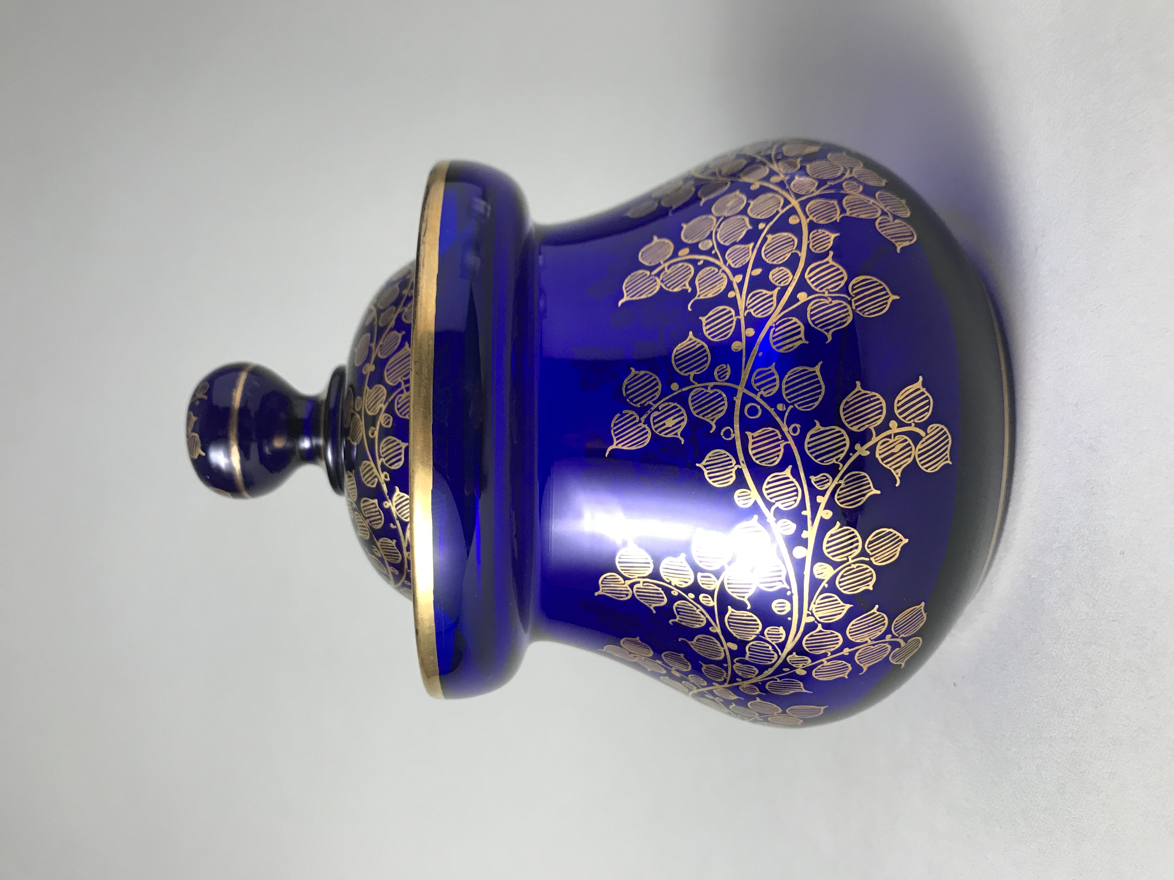 Helder kobaltblauw glas. Vlakke bodem. Bolvormig lichaam met opstaande verdikte rand. Gewelfd deksel met bolvormige knop. Op lichaam en deksel in verguldsel bladranken. Verguldsel op rand en deksel.
