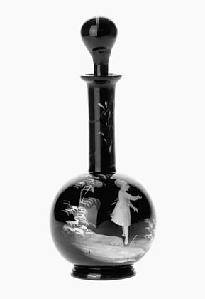 Door de wijze van beschildering (wit email op gekleurd glas) en het onderwerp (spelende kinderen) behoort de karaf tot het zogeheten Gregory-glaswerk. Mary Alice Gregory (1856-1908) werkte in de jaren tachtig van de negentiende eeuw een aantal jaren als decoratieschilderes bij de Boston & Sandwich Glass Compagnie in de Verenigde Staten. Feiten over het leven en werk van Gregory stemmen echter niet overeen met de massale productie van het naar haar genoemde glas, dat tot ver in de twintigste eeuw in grote hoeveelheden in Bohemen is vervaardigd. ( Annemarie den Dekker)