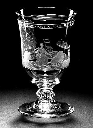 Helder kleurloos glas. Licht conische voet. Korte stam met schijf en knoop met luchtbellen. Klokvormige kelk. Op kelk een kraamkamer met kraamvrouw in bed, baker met wieg, vuurmand en tafel waarop twee dekselbekers en een schaaltje met lekkernijen. Boven de voorstelling een tekstlint met het opschrift: T. WELVAAREN. VAN DE KRAAM VROUW./.