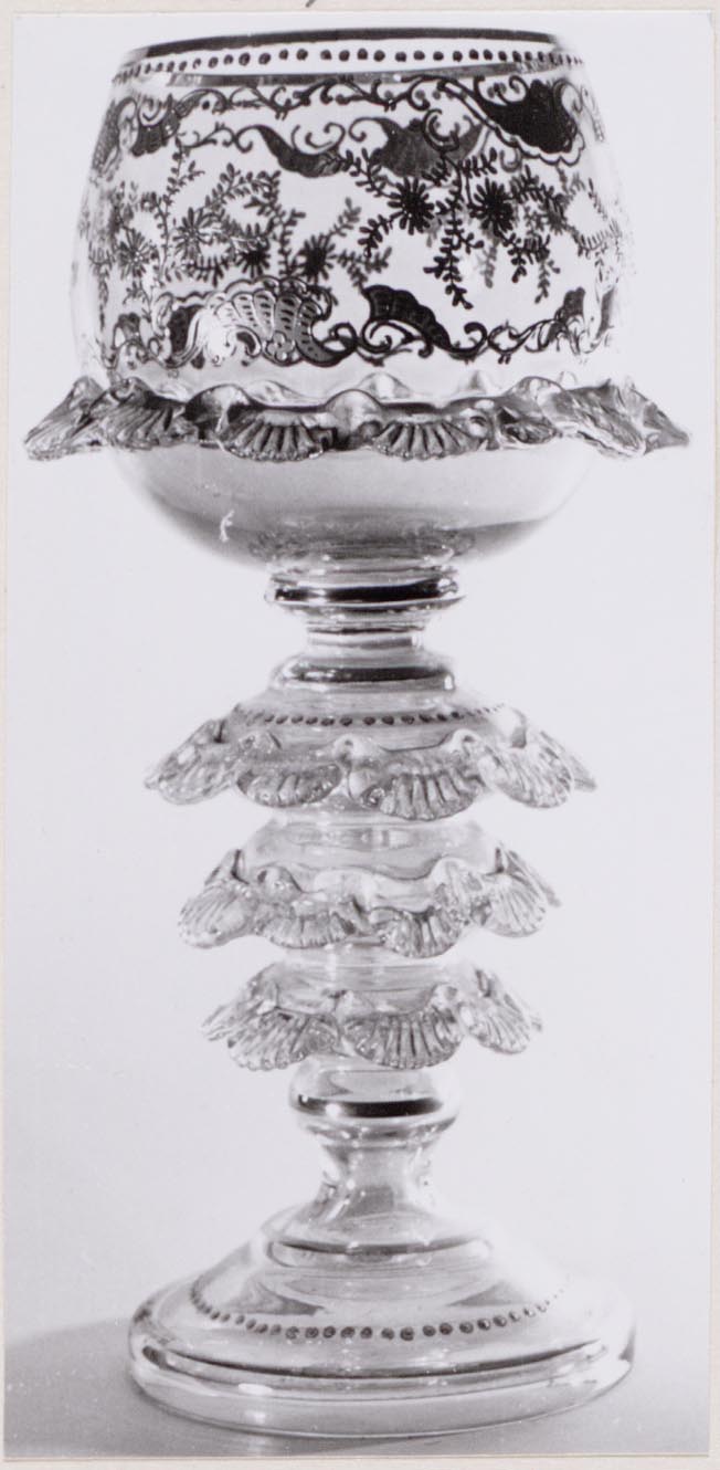 Helder geel, helder roze en helder kleurloos glas. Gewelfde voet, aan één stuk geblazen met stam. Voet en stam van helder geel glas. Stam opgebouwd uit vier geledingen. Schijf. Bolvormige kelk van helder roze glas. Rondom drie geledingen en kelk een glasdraad van helder kleurloos glas met geknepen ribbelpatroon. Rondom kelk in verguldsel twee banden met bloemtakjes en rocaillemotieven. Vergulde banden op voet, geledingen, kelk en mondrand. Op onderzijde voet het nummer: 140/ D640./.