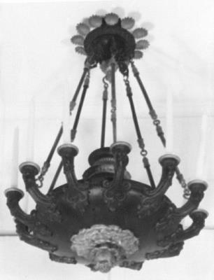 Twaalf kaarsenhouders bevestigd aan een ronde schaal, hangende aan zes kettingen- Trefwoorden