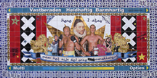 Tableau met quasi-traditionele omlijsting van blauwe Marokkaanse tegels waarin de Andreaskruisen uit het wapen van Amsterdam zijn verwerkt. Binnen een tweede computerachtige kader, links en rechts: de Amsterdamse vlag met (Marokkaanse) sterren en twee klimmende Nederlandse leeuwen. Tussen de vlaggen centraal het portret van Willem van Oranje naar Adriaen Thomasz. Key, omgeven door verscheidene personen, waaronder prominent twee kickboksers.