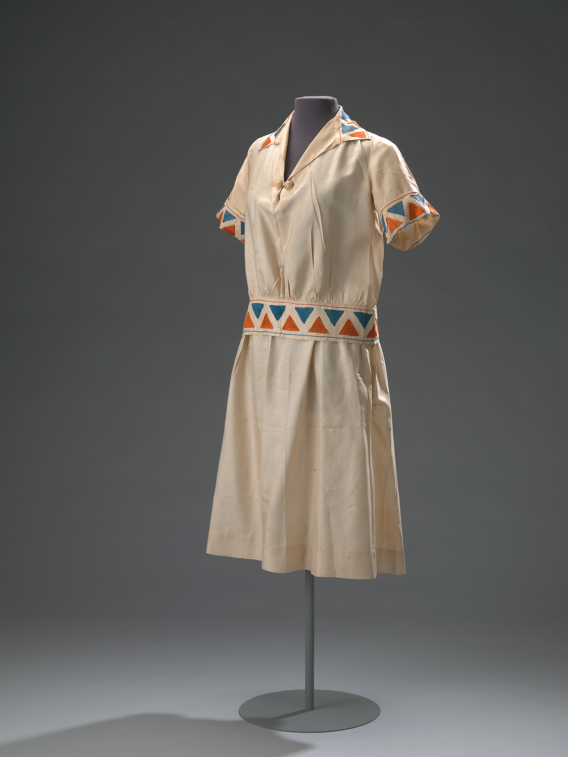 Naturelkleurige jurk met borduursel en twee beklede knopen- Trefwoorden