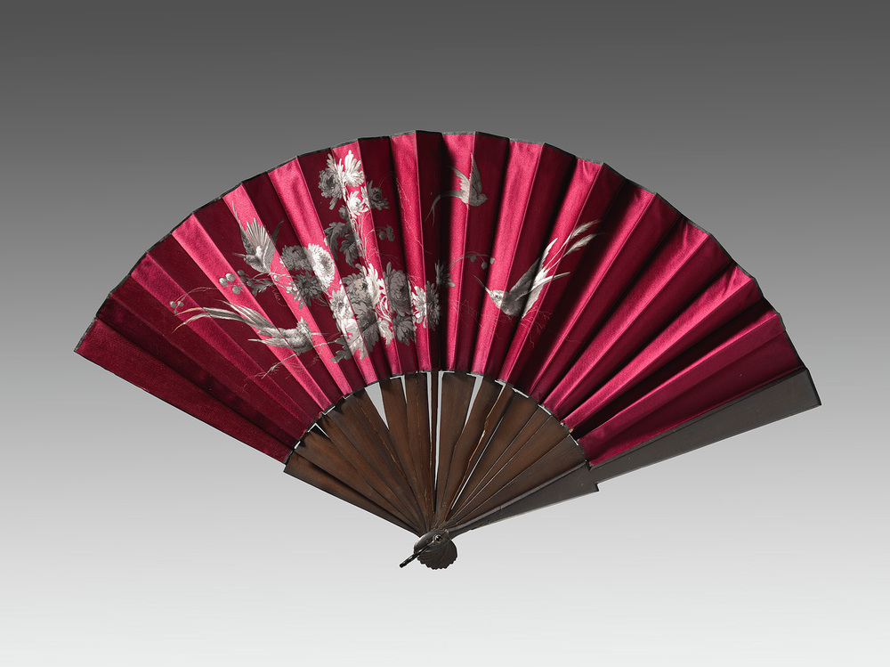Vouwwaaier met houten benen en dubbel zijden blad op voorzijde beschilderd met bloemen en vier vogels.