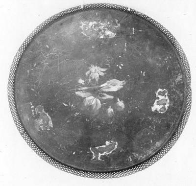 Rond model met opstaande open rand. Beschilderd met bloemen en papegaai- Trefwoorden