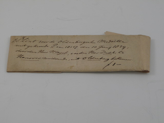 - opschrift voorop: Blw: Lint voor de Oldenburgsche Medaille met gekroond P. van 1815; den 10 Junij 1839, door den Heer Mazel, van den Heer Dedel, te Hanover residerende, uit Oldenburg bekomen. f1-