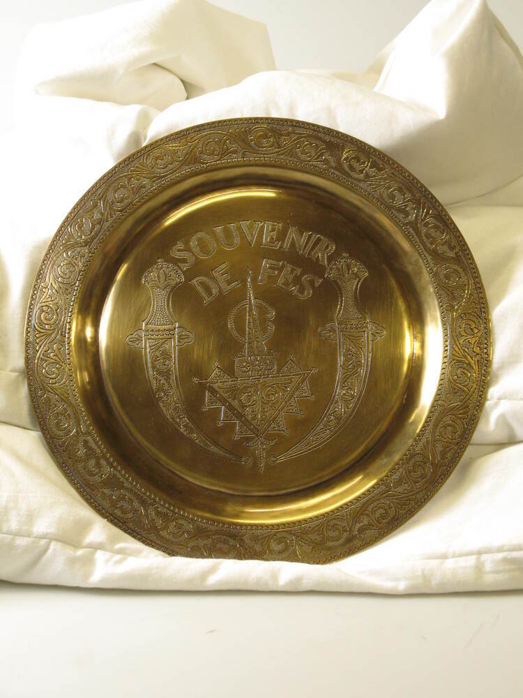 Koperen bord met inscriptie SOUVENIR/ DE FES tussen afbeelding van twee dolken.- Trefwoorden