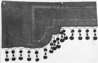 Val in de vorm van een rechte koof, over het geheel aan de rand afgezet met bies in bloemmotief.- Trefwoorden