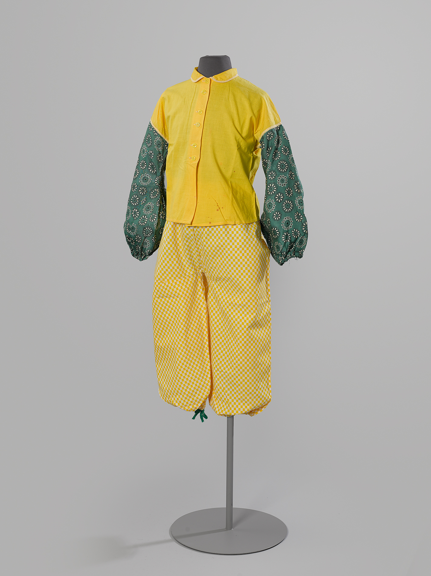 1. blouse van geel katoen, kraagje, middenvoor zes knoopjes. Aangezette, lange mouwen, flanel, groen met bloemmotief. 2. (Pyama)broek. Geel geblokt, pijpen worden aangetrokken d.m.v. groen band.