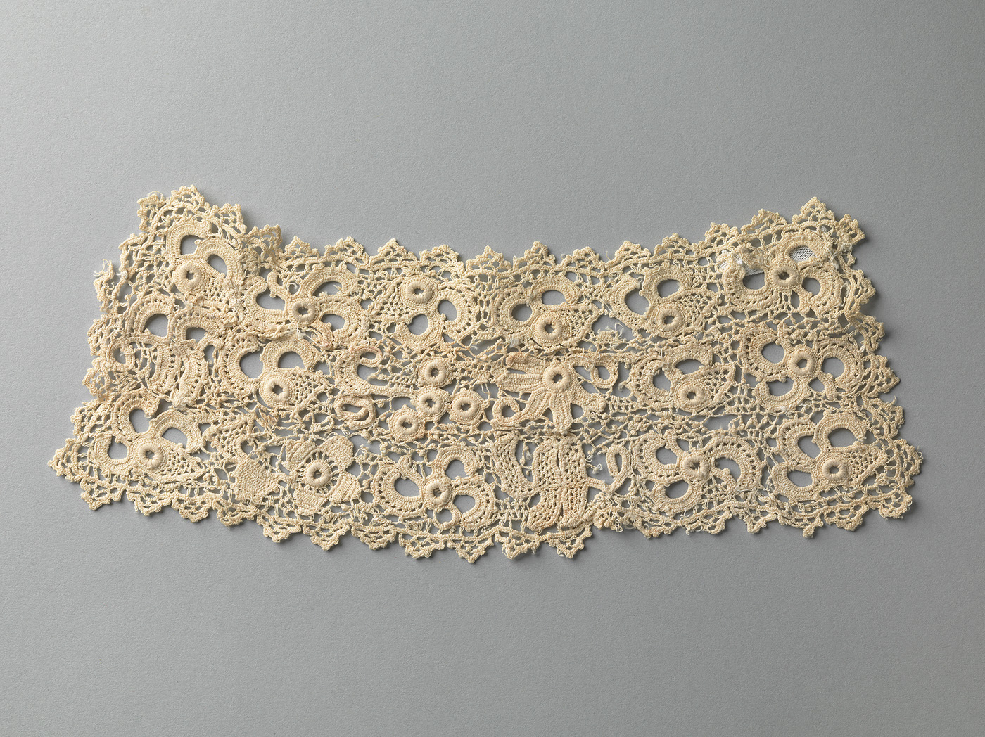 Japonkraag met twee manchetten, van mogelijk machinaal Iers haakwerk. De manchetten horen mogelijk niet bij de japonkraag.