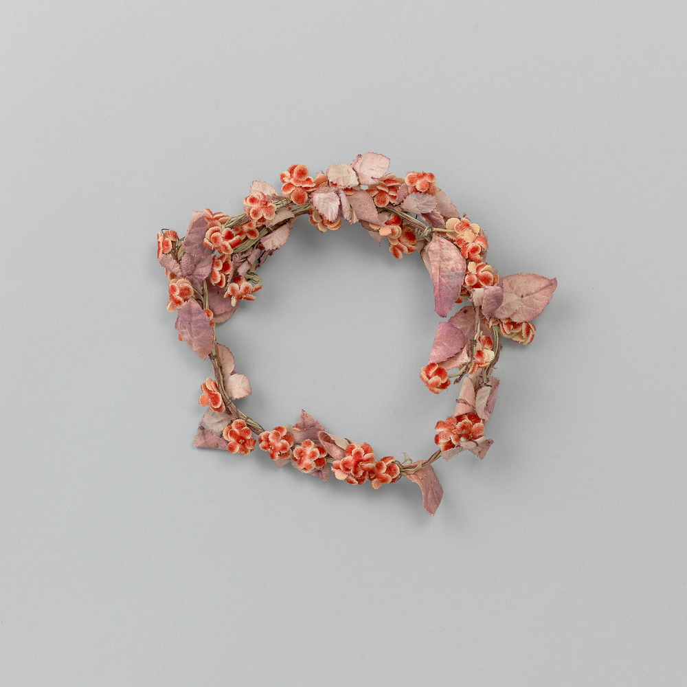 Bloemenkrans van ijzerdraad met kleine rode bloemen en roze bladeren. Gedragen door Madeleine van Soest-Insinger (1920-2010) als bruidsmeisje in 1926 bij het huwelijk van Dolly van Sprengler-Röell.