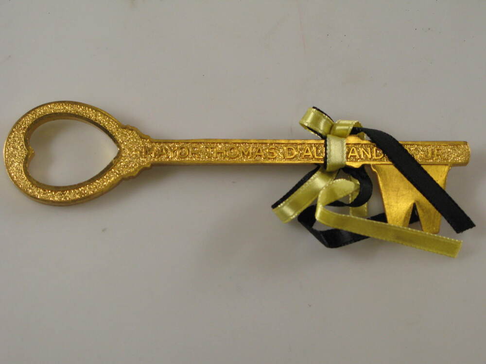 Bronzen sleutel met tekst: MAYOR THOMAS D'ALESANDRO, JR. Om sleutel is geel en zwart lint gestrikt.- Trefwoorden