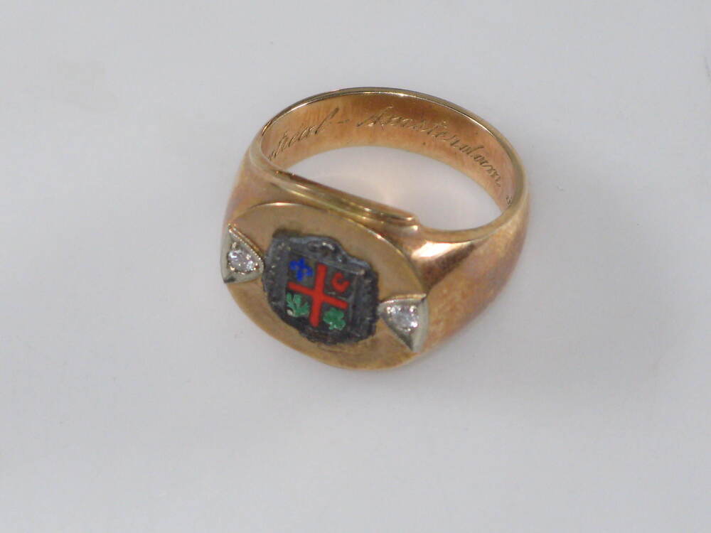 Gouden zegelring met twee diamantjes en wapenschild. Aan binnenzijde tekst gegraveerd: Montreal-Amsterdam Juin 1949.- Trefwoorden