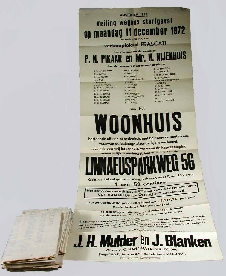 Affiches voor openbare verkoop van onroerend goed, 1971 - 2000 Amsterdam papier hoogte: 128 cm; breedte: 52 cm; schenking 2004-08-30 inv.nr. A 55412.1 in depot